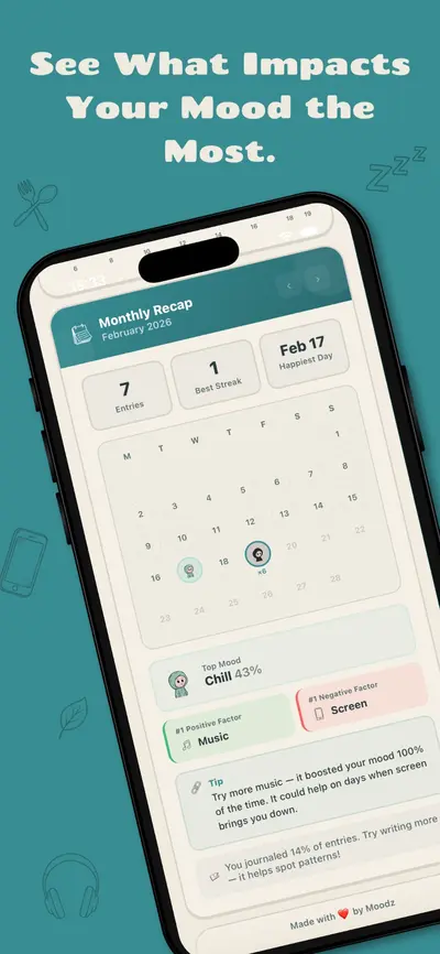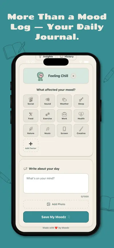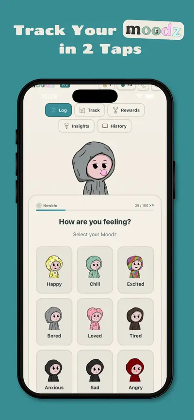 The Moodz app is your daily companion for tracking how you feel. Pick your character, log your mood, and discover what affects your day. Track consistently to level up your character from Newbie to Legend — unlocking visual rewards like aura effects, animated backgrounds, and exclusive hoodies along the way. Collect coins, unlock badges, and spend in the Hoodie Shop and Theme Shop to customise your look.